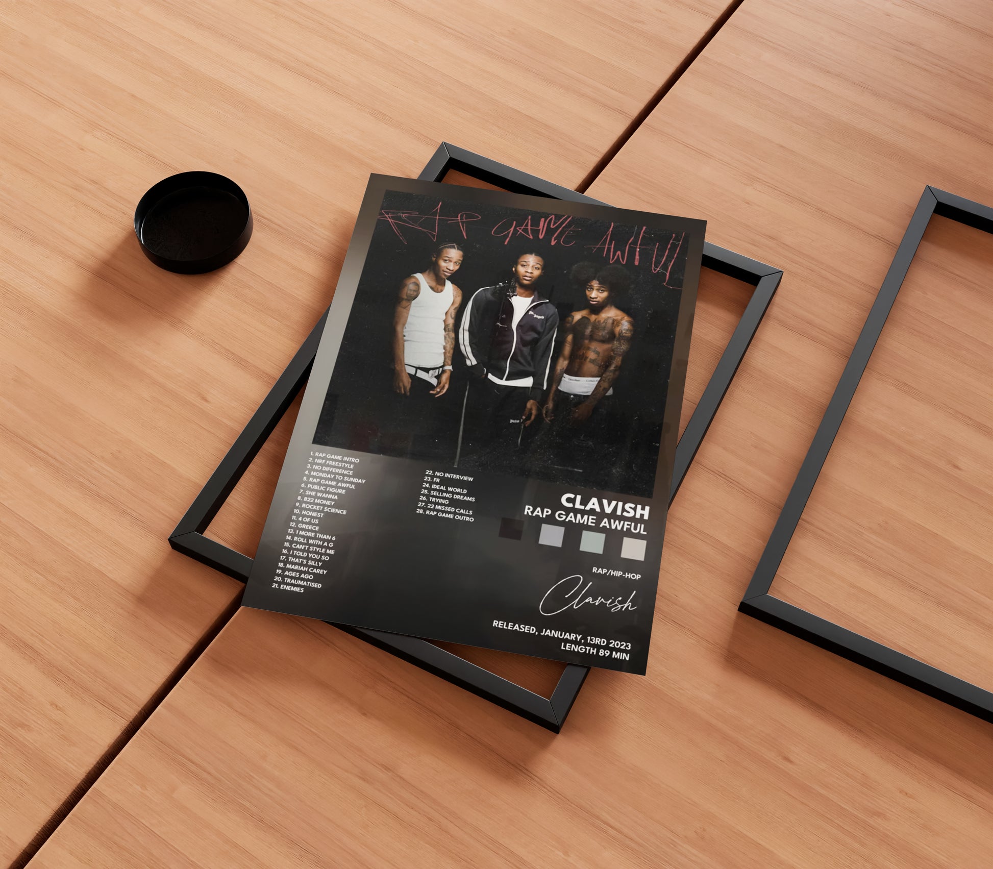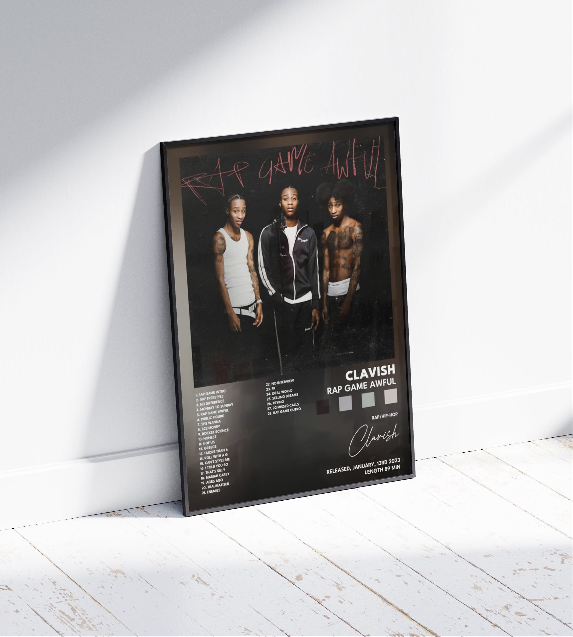 Showcase your admiration for Clavish with the 'Rap Game Awful' album poster, a premium piece that captures the essence of this iconic release. Crafted with sharp, high-resolution imagery, this poster serves as a visually compelling tribute to Clavish’s unique impact on the rap scene. Printed on durable material, it maintains vivid colors and intricate details, ideal for enhancing any music space or collection with authenticity and style.