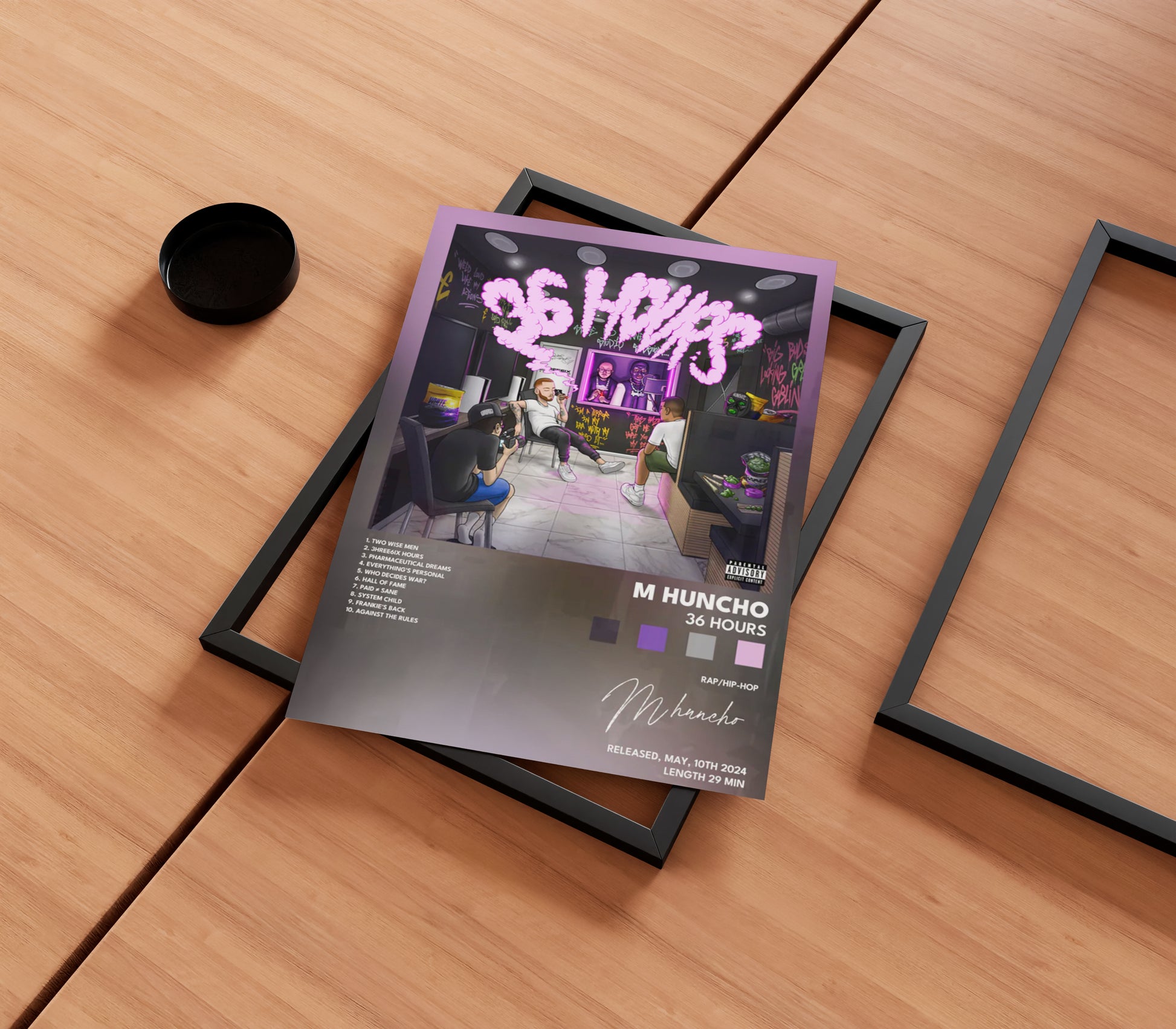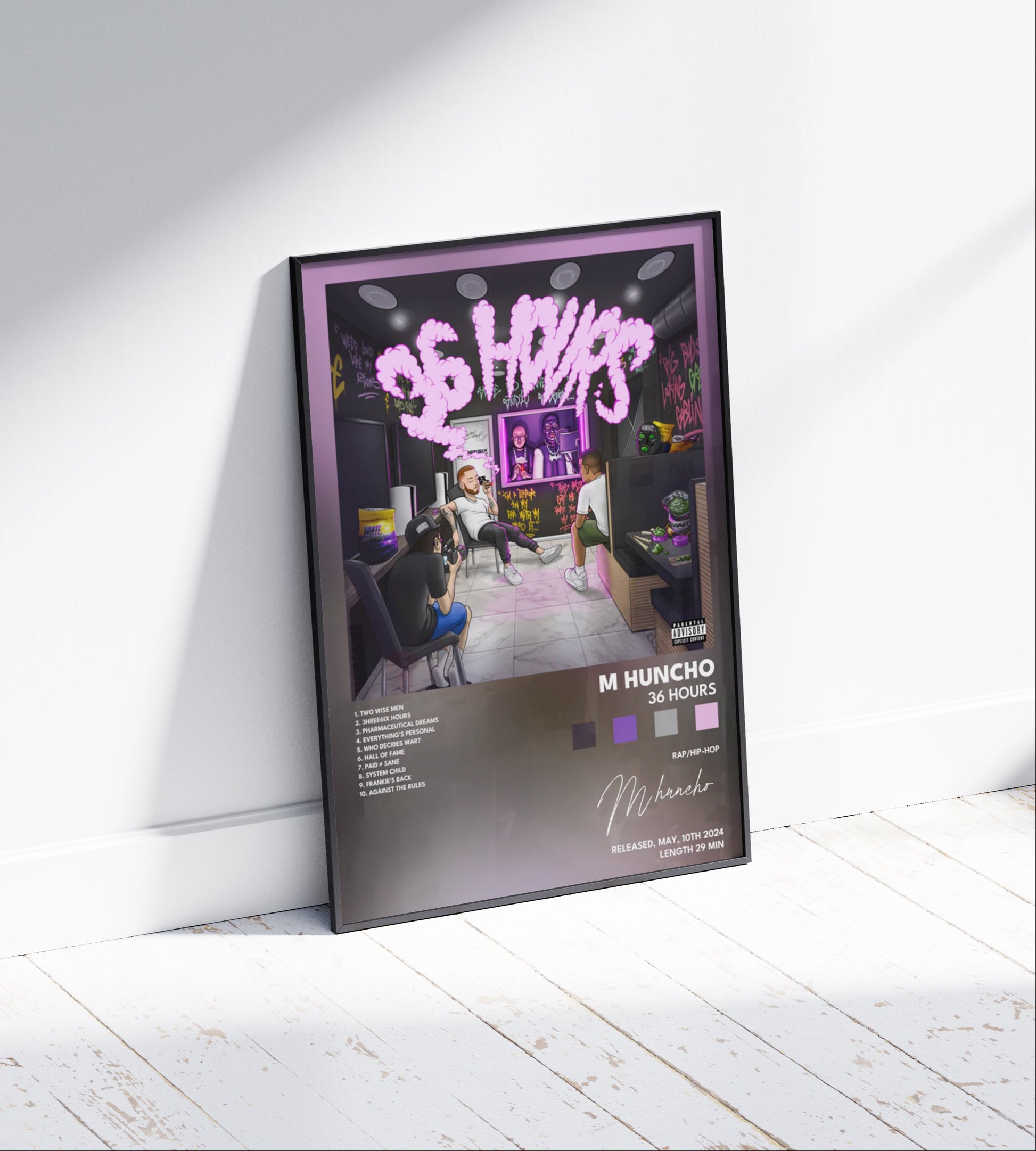 Celebrate M Huncho's groundbreaking '36 Hours' album with this expertly crafted poster, designed for true fans and collectors. Featuring high-quality print and striking visuals inspired by the album's theme, this poster adds a sophisticated urban edge to any space. Perfect for showcasing your appreciation of M Huncho's unique sound and style.